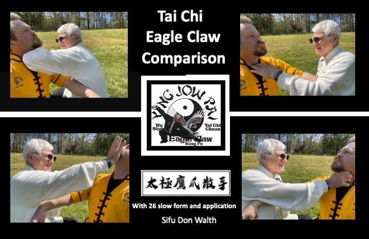 Master Walth has defined these similarities between the two styles and some of the applications between the Eagle Claw Principles and the Wu Style 26 form. It defines the pressure points and how to use them using Dim Mak, Da Mak and Na Mak. The Wu form is included. $35.00 with shipping. email eagleclawtaichi@gmail.com